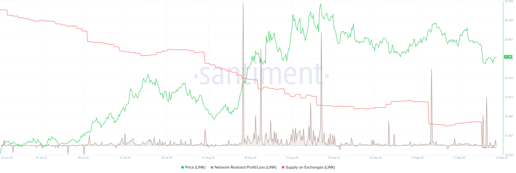 Chainlink价格(LINK)正在逼近重要支撑区,因抛出止盈压力增加而回落至22 USD以下,在周四的交易中。链上数据透露出短线的悲观信号,但各大交易所强劲的净流出表明许多投资者正在默默吸筹区。这反映了市场的整体情况,投资者的心态既谨慎又抱有乐观的希望。
