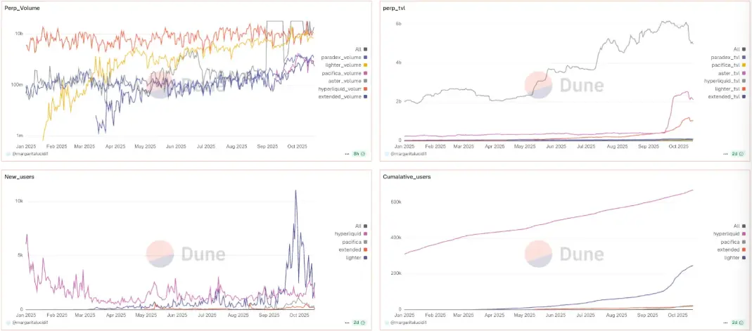 在 10 月初,Hyperliquid开启了无需许可的上市(HIP-3)。现在,构建者可以通过质押 50 万HYPE来上线永续合约市场,同时设有限制,如验证者惩罚和未平仓量上限。此举恰逢去中心化永续合约在与 CEX 的市场份额竞争中创下新高,为「链上正在获胜」的叙事添柴加火。