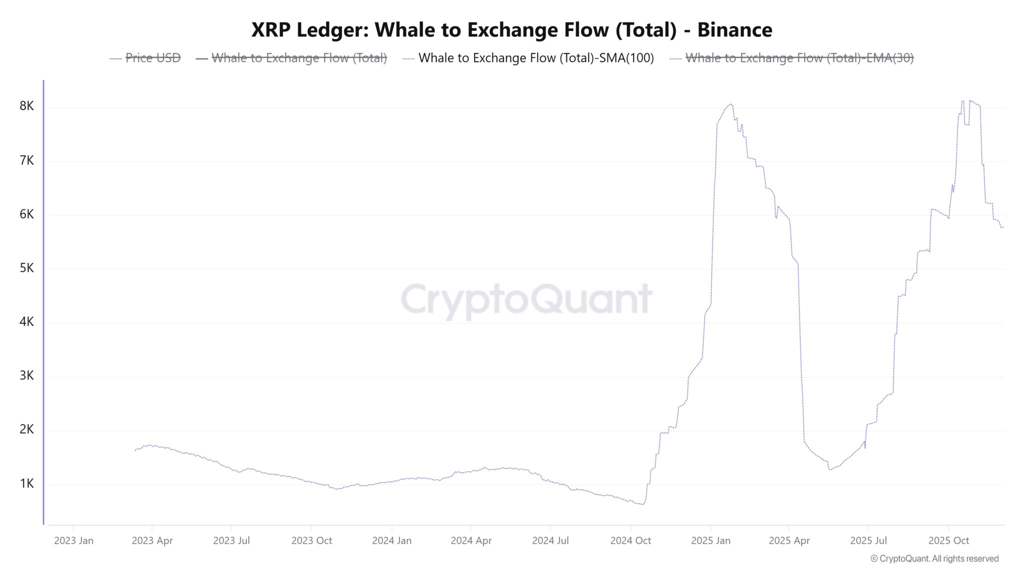 CryptoQuant的100日SMA巨鲸流入交易所指标在11月6日见顶,显示这一分布趋势持续数月,具有结构性,而非突发性。