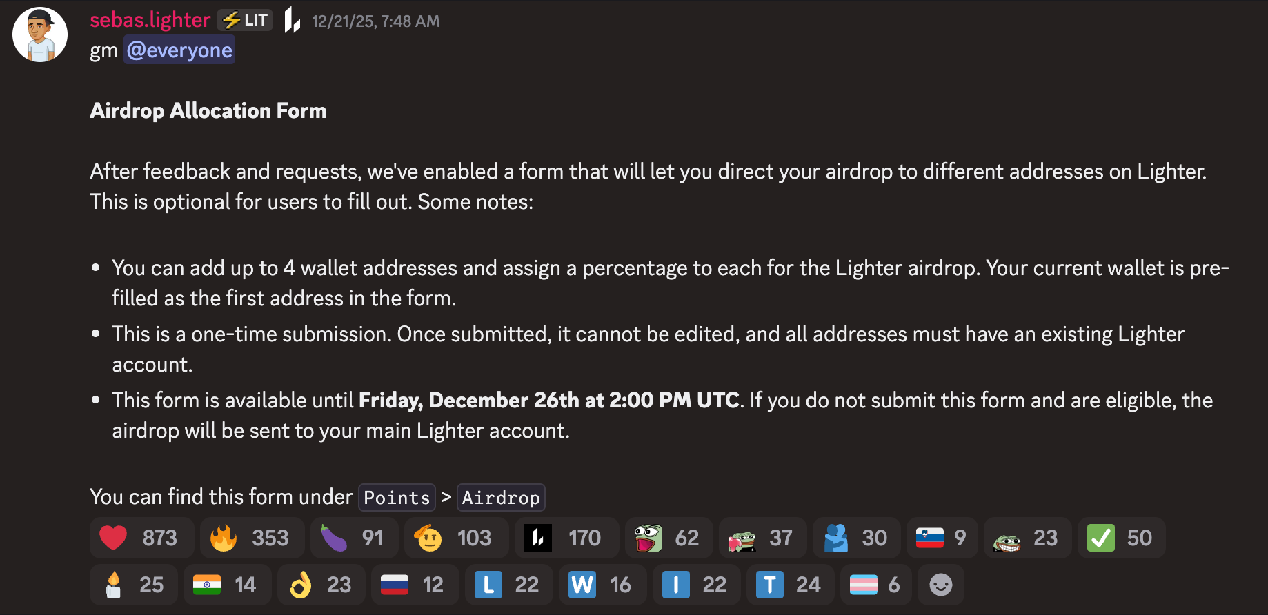 “如果您不提交此表格且符合条件,空投将发送到您的主Lighter账户,”Sebas在Discord上说道。