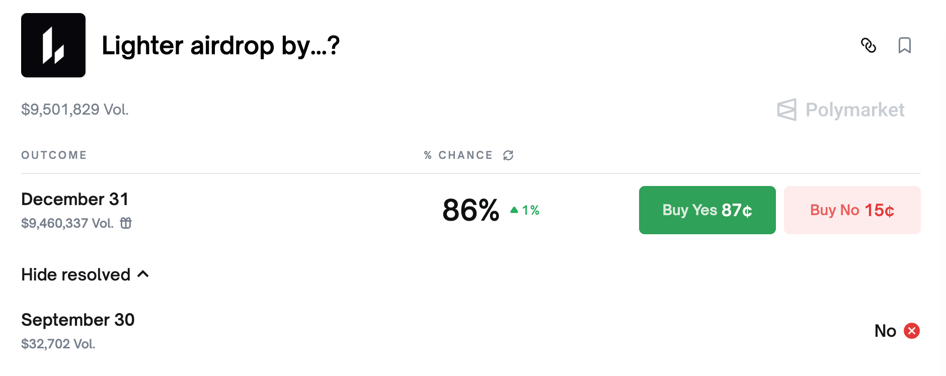 Lighter,一个永久去中心化交易所(perp DEX),作为Hyperliquid的主要竞争对手,正在推动空投猜测,因为Polymarket交易者押注于在年底前推出代币。