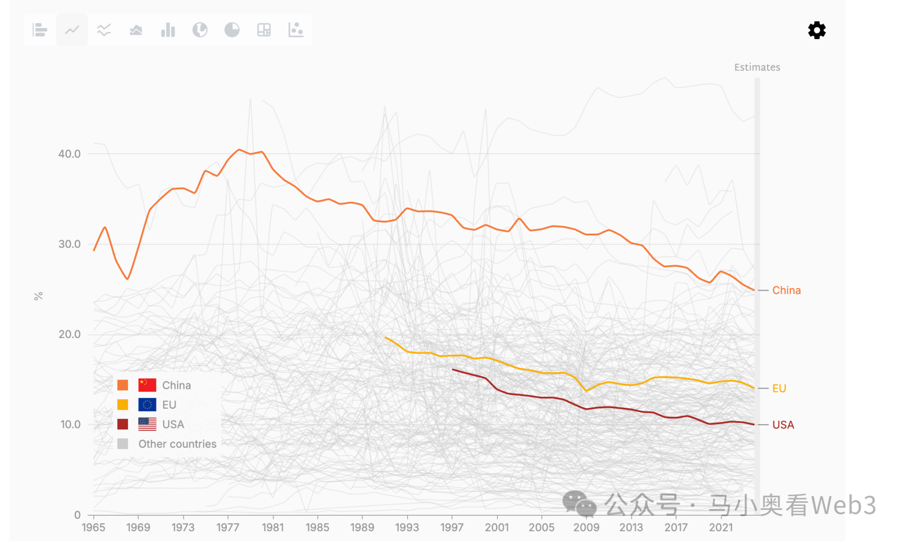当然汇率风险也在于如何解决与欧盟的政治摩擦。由于欧盟各国大多为已发达国家,且制造业在 GDP 占比远比美国来的更高(欧洲制造业占 GDP 比例达到 15%,而美国则为不到 10%),这就意味着欧洲普通民众的主要收入中工资收入,相对于投资带来的资本利得的占比更高。在过去一段时间内,欧盟由于失去了俄罗斯廉价的能源供应,导致成本攀升,制造业受到了不小的影响,特别是由于中国的产业升级,对欧洲的支柱型产业之一,汽车产品产生了极大冲击。这就意味着欧洲整体产业利润的下降,企业利润的下降带来的两个影响是政府税收的下降,以及工资增速的放缓。前者也会通过财政紧张,进而影响欧洲原有的高福利的维持。这两者都将使得居民的财富效应降低,进而影响消费。而投资方面,由于缺乏 AI 方面的优质标的,欧洲失去了在 AI 领域的资本竞争能力,欧洲资本大都流出到美国的 AI 市场中,以争取更高的预期回报。因此投资方面也不容乐观。所以在这个基础上,净出口对经济的影响就会被放大,因此欧洲各国政府对贸易逆差的态度也更为激烈。