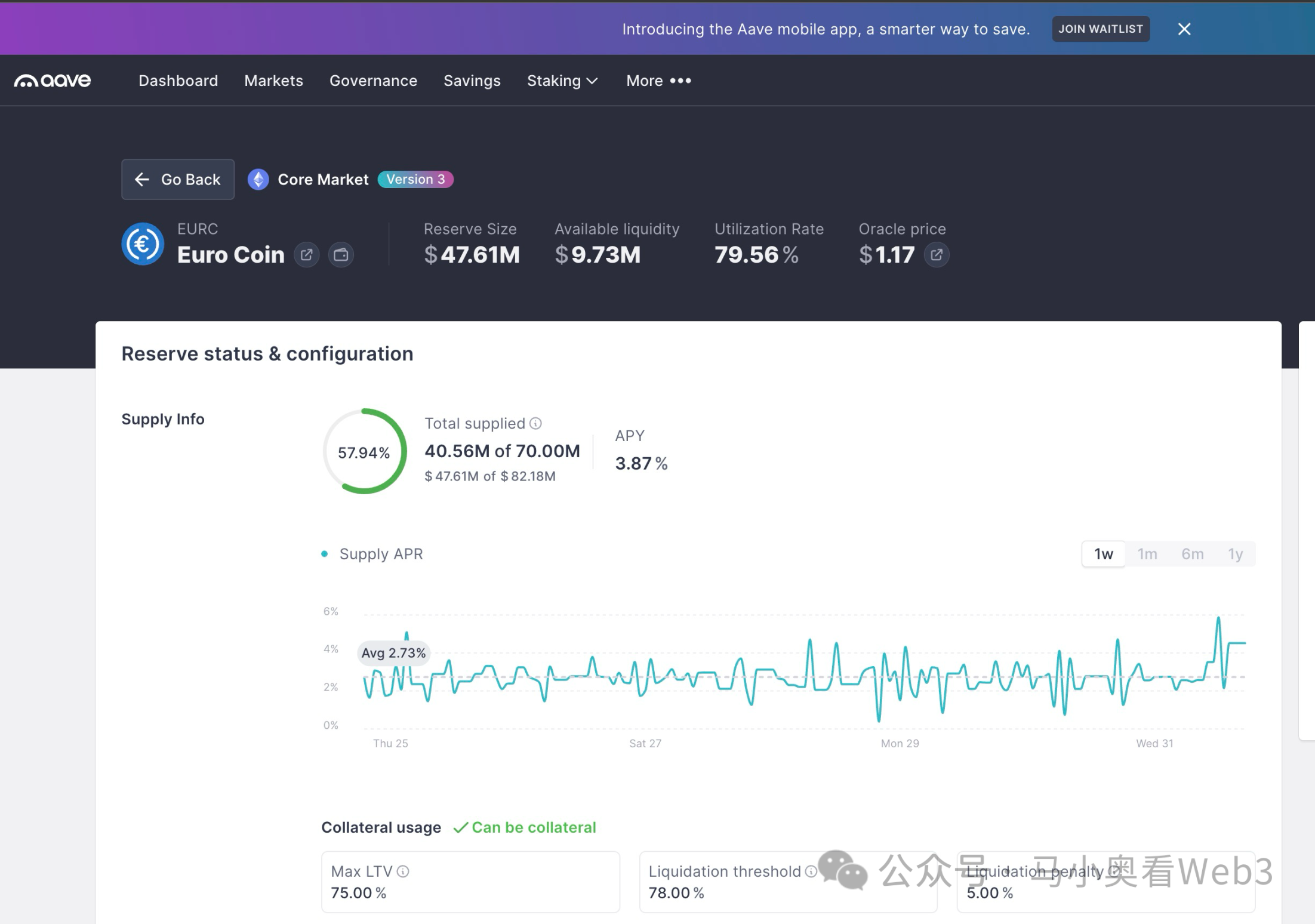 回到汇率对冲策略来说,笔者认为一个切实可行的策略是将美元稳定币兑换为 EURC,然后可以选择存放到 AAVE 等头部平台赚取利息,以当前利用率来看,出借利率可以达到 3.87%,也是比较香的。如果想保持对 BTC 等风险资产的头寸,又想对冲汇率风险,可以选择以 EURC 作为抵押品,借出美元稳定币,再进行资产配置,例如购买 BTC。