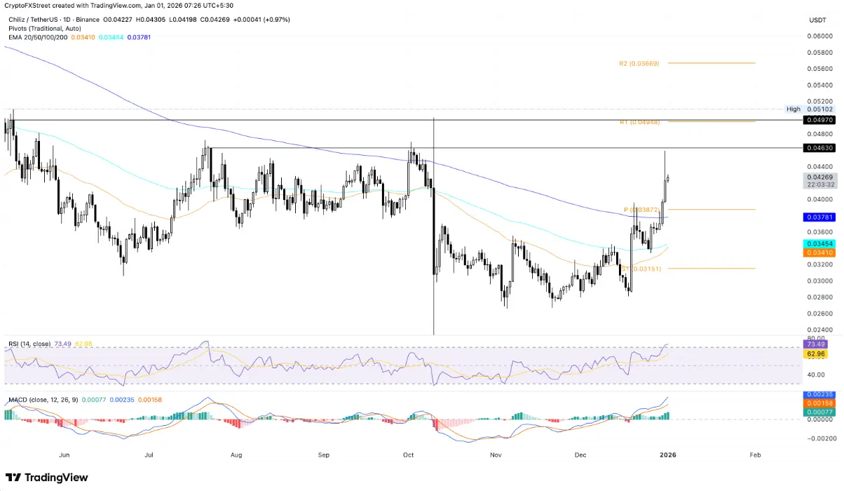 截至本文撰写时(星期四),Chiliz (CHZ) 当前交易在 $0.04200 附近,延续前一交易日录得的6.50%的涨幅。这次反弹标志着连续第四个涨价日,周内 CHZ 的累计涨幅超过17%,显示买盘逐渐占优。