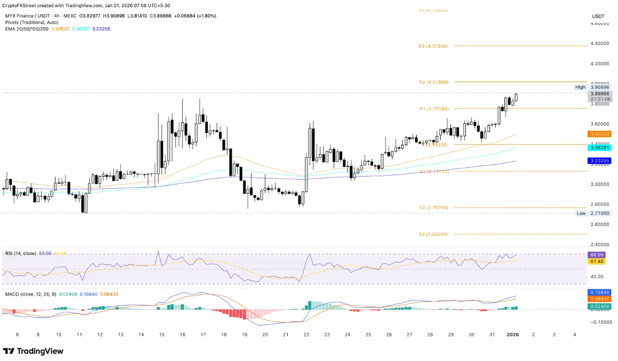 MYX Finance 当前交易在 $3.90 附近,随着多头继续努力突破心理关口 $4 ,在周三实现6.56%的突破后。星期四,MYX 继续保持积极态势,涨幅近2%,连续第九个交易日上涨,短期内趋势稳步向上。