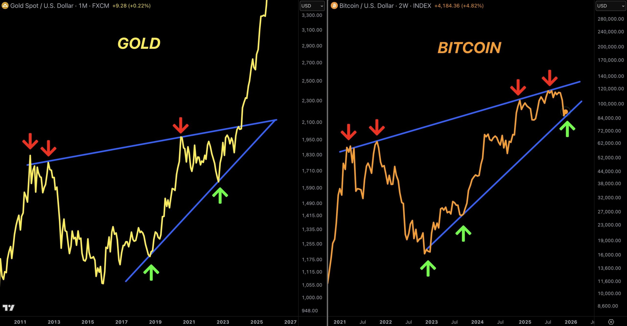 比特币当前的走势图显示出极为相似的结构。从$120,000–$126,000区域的拒绝,反映出黄金早期失败的突破尝试,而BTC在大致$80,000到$90,000之间的持续盘整,则对应黄金在其上涨前表现出的磨底行为。在这两种情况下,价格走势都表现为压缩的波动性、反复的支撑测试,以及尚未被有效突破的上升阻力线。