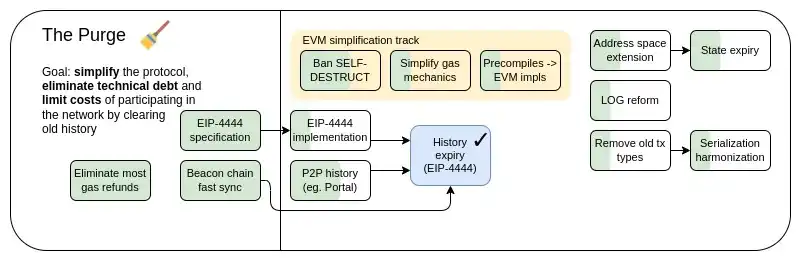 剩下的主要工作包括构建和集成一个具体的分布式解决方案来存储历史记录——至少是执行历史记录,但最终还包括共识和 blob。最简单的解决方案是 (i) 简单地引入现有的 torrent 库,以及 (ii) 称为 Portal 网络的以太坊原生解决方案。一旦引入其中任何一个,我们就可以打开 EIP-4444。EIP-4444 本身不需要硬分叉,但它确实需要新的网络协议版本。因此,同时为所有客户端启用它是有价值的,否则存在客户端因连接到其他节点期望下载完整历史记录但实际上并未获取而发生故障的风险。