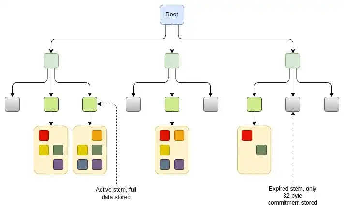 这些提案之间的主要区别是:(i)我们如何定义「最近」,以及(ii)我们如何定义「块」?一个具体的提案是 EIP-7736,它建立在为 Verkle 树引入的「茎叶」设计之上(尽管与任何形式的无状态状态兼容,例如二叉树)。在这种设计中,彼此相邻的标头、代码和存储槽存储在同一个「主干」下。一个茎下存储的数据最多可以是 256 * 31 = 7, 936 字节。在许多情况下,帐户的整个标头和代码以及许多密钥存储槽都将存储在同一个主干下。如果给定主干下的数据在 6 个月内没有被读取或写入,则不再存储该数据,而是仅存储该数据的 32 字节承诺(「存根」)。未来访问该数据的交易将需要「复活」数据,并提供根据存根进行检查的证明。