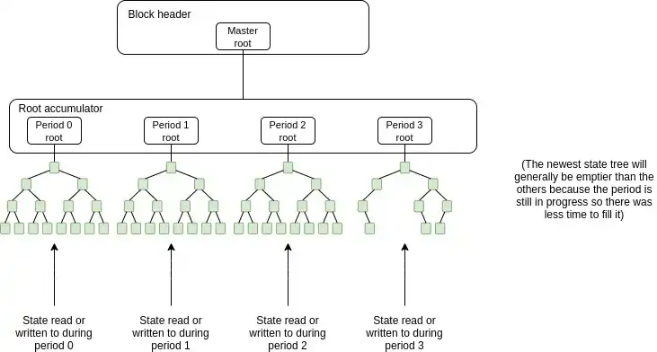 基于地址周期的设计是解决这个问题的最著名的想法。我们不是用一棵状态树存储整个状态,而是有一个不断增长的状态树列表,并且任何读取或写入的状态都会保存在最新的状态树中。每个时期(例如: 1 年)添加一次新的空状态树。老树都冻得严严实实的。完整节点仅存储最近的两棵树。如果一个状态对象在两个周期内没有被触及,从而落入过期树中,它仍然可以被读取或写入,但交易需要证明它的 Merkle 证明 - 一旦证明,就会保存一个副本再次在最新的树中。