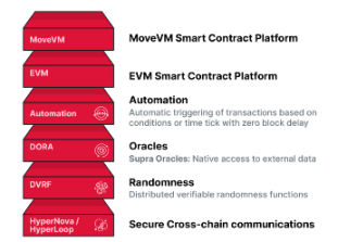 在现有区块链生态中,很多公链的设计思路通常将共识、数据可用性和执行功能集成于核心网络中,将其他基础设施(如预言机、跨链通信、链上随机性等)交由其他协议等进行,会造成集成复杂性、安全风险增加以及开发成本上升。Supra L1 通过垂直集成的方式,将预言机、跨链通信、自动化和链上随机性(VRF)等关键服务直接在 L1 进行内置,使所有服务共享一致的安全性,避免传统跨链通信中的延迟和安全性问题。