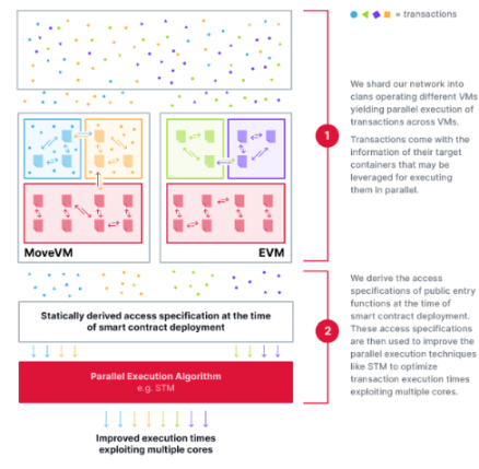 「部落 - 氏族」节点管理架构在节点管理上采用了分层和随机化的方式,其中部落代表由众多大型节点构成的部落集合体,而氏族则代表部落内部随机选定的小型节点集合,在部落内部随机选定小型节点组成氏族,确保每一层的拜占庭行为风险被控制在最低,提供了高度的弹性和鲁棒性。而节点资源将根据需求动态分配,不同任务分配予不同的氏族且可以并行执行。该机制可保证 Supra 网络即使在拜占庭节点被干扰的情况下也能保持正常运作,并提高多维度的计算与执行效率,而独特的架构通过在网络和节点级别实现并行执行来增强可扩展性和安全性。其在 L1 设置的随机节点重组确保了安全性,而基于 VRF 的随机性则增加了对针对性攻击的抵抗力。