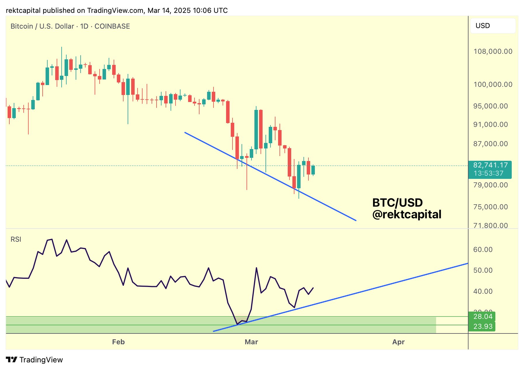 化名分析师Rekt Capital在社交媒体平台X上告诉他的542,500名粉丝,比特币的相对强弱指数(RSI)指标在日线图上闪烁看涨背离。